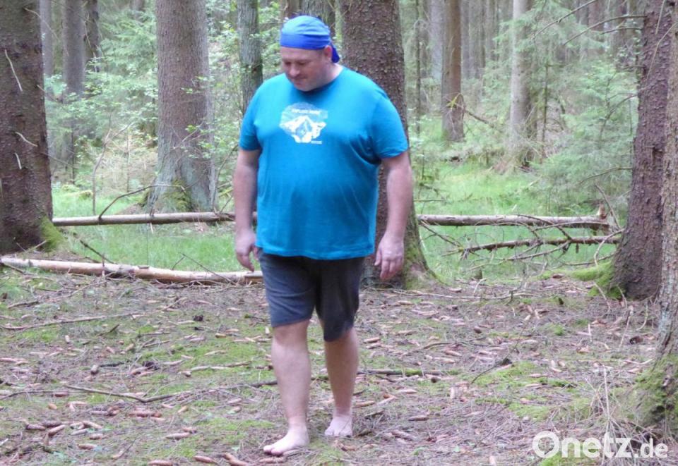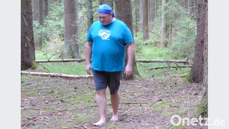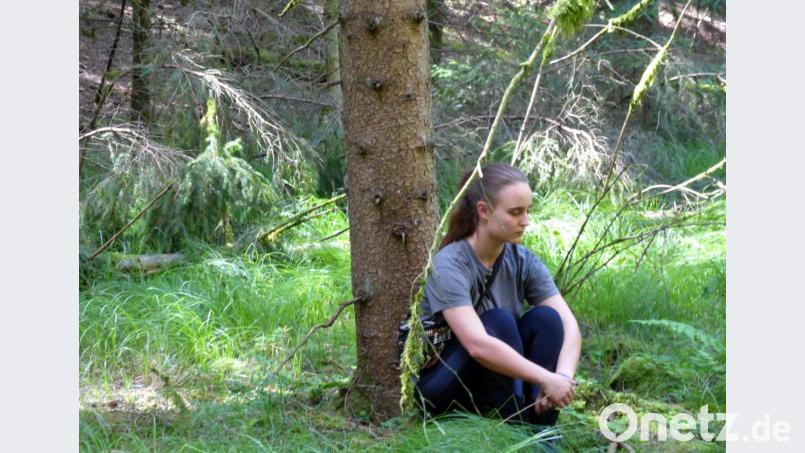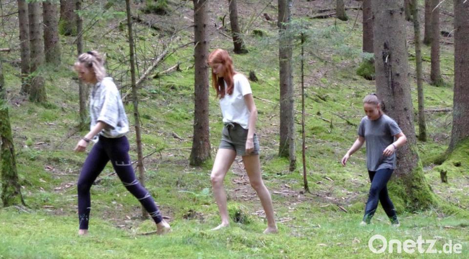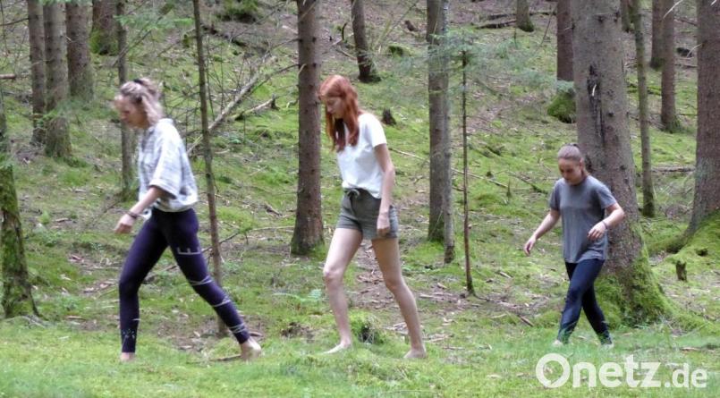 Nun hieß es, auf dem bewachsenen Waldsteig den unterschiedlichen Untergrund und Unebenheiten wahrzunehmen und das leichte Schwingen des moosigen, mal von der Sonne beschienenen, mal im Schatten liegenden Bodens zu spüren. Schließlich spazierten alle barfuß in den Wald: die kostengünstigste Fußzonenreflexmassage, die es gibt. Für die junge Marie ein besonderes Gefühl: „Es piekst zwar schon mal, aber das probiere ich demnächst alleine aus.“ Und für Freundin Emma war es das erste Mal, ohne Schuhe durch den Wald zu laufen.