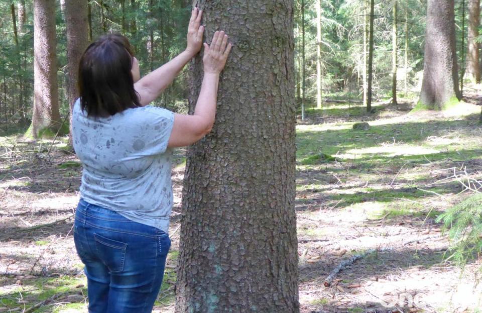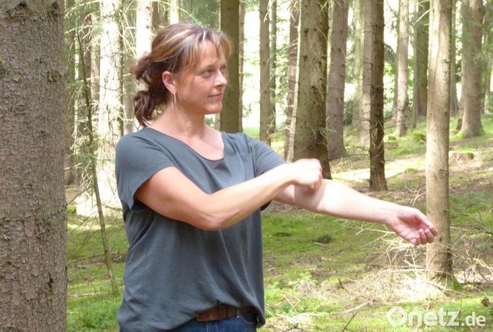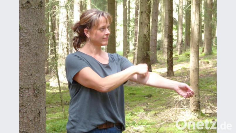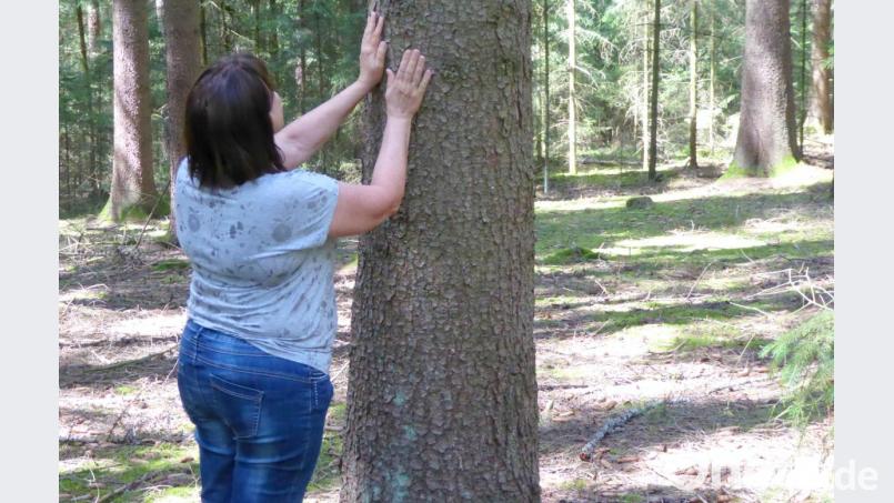 Sie begann mit Übungen zur Aktivierung der Lebensenergie: kleine Klopfmassagen à la Qi Gong mit den Fingerspitzen, der flachen Hand oder der Faust auf verschiedene Körperpartien. Sie endeten mit dem schwungvollen „Öffnen der Tore des Lebens“, bei dem im Stand das Becken gedreht wird und die Arme sanft auf den Körper schlagen. Nach einem kurzen Schlendern auf einem Waldweg ging es darum, einen Baum auszuwählen, ihn „in Besitz“ zu nehmen und bei bewusster Bauchatmung zu meditieren. Der sanfte Ton einer Klangschale holte alle nach einigen Minuten zurück.