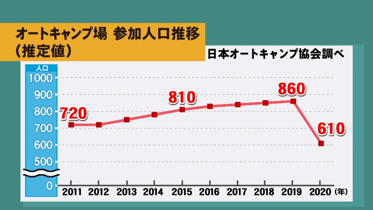 日本オートキャンプ協会の調べによりますと、新型コロナの感染拡大前、1年間に1回以上オートキャンプ場を利用した人の数は年々増加しています。