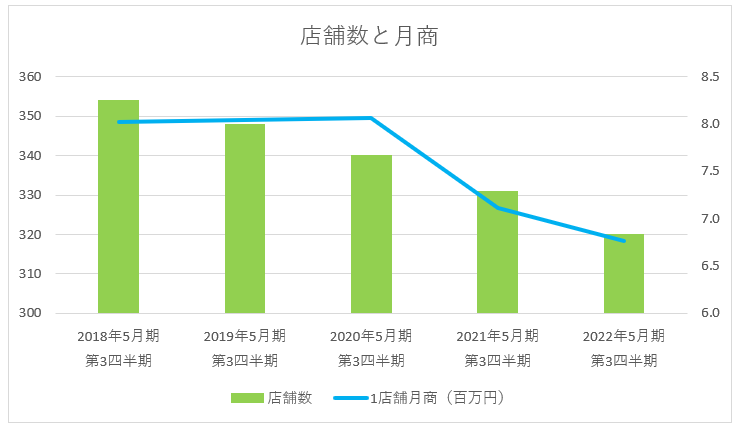 コロナを機に不採算店を閉鎖しました。2022年2月末時点の店舗数は320。2020年2月末と比較して20店舗減少しています。店舗を整理したものの、集客力はコロナ前の水準まで回復しておらず、2022年5月期第3四半期のヴィレッジヴァンガードの1店舗当たりの月商は680万円ほど。2020年5月期第3四半期の810万円から16.2%減少しています。