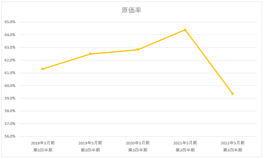 ヴィレッジヴァンガードは、1店舗当たりの稼ぐ力が著しく失われたため、原価を抑制して利益が出る体制へとシフトしました。2022年5月期第3四半期の原価率は59.4%。2020年5月期第3四半期と比較して3.5ポイントも下げています。収益認識の基準を合わせた場合の原価率も61.3%であり、1.5ポイント抑制しています。