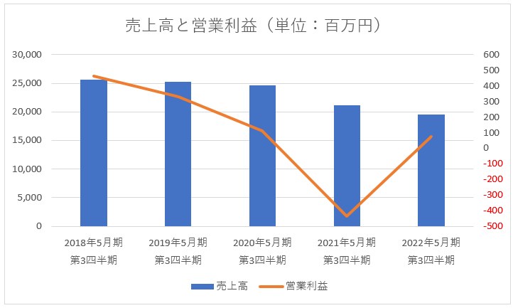 ヴィレッジヴァンガードはコロナ禍の2021年5月期第3四半期の売上高が前期比14.1%減少。2022年5月期第3四半期の売上高はそこから更に8.1%もの減少に見舞われています。コロナ前の2019年5月期第3四半期の売上高と比較すると22.8%の減少です。
