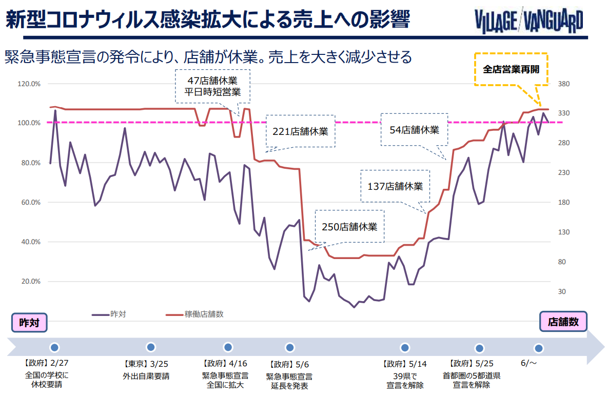 ショッピングモールや繁華街への出店が多いヴィレッジヴァンガードは、緊急事態宣言の影響を強く受けました。2020年5月は250店舗の休業を余儀なくされ、一時売上高は前年対比で20%を下回る水準まで低下しています。