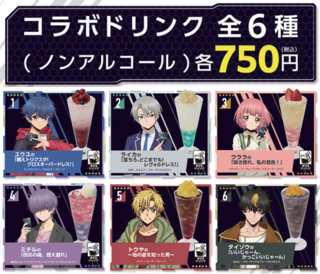 コラボドリンクには、「カードファイト!! ヴァンガード will+Dress」のキャラクターをイメージした全6種【各750円(税込)】をご用意します。注文特典として、コラボドリンク1品ご注文につき、オリジナルポストカード(全24種:第一弾6種/第二弾18種)の中からランダムで1枚プレゼントします。