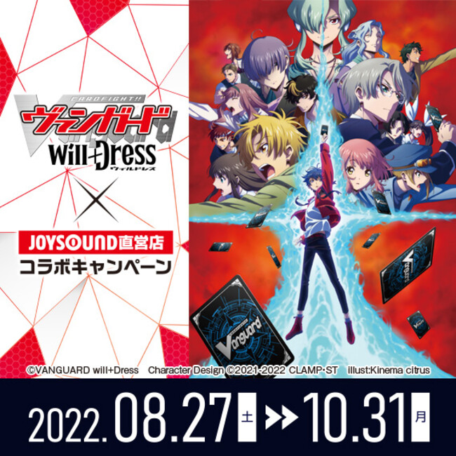 株式会社エクシングの子会社で、全国にカラオケ店舗を展開する株式会社スタンダード(本社:東京都港区、代表取締役社長:米田洋一)は、2022年8月27日(土)から2022年10月31日(月)までの期間中、『「カードファイト!! ヴァンガード will+Dress」×JOYSOUND直営店コラボキャンペーン』と題し、JOYSOUND直営店30店舗にて、オリジナルデザインのポストカード付きコラボドリンクを展開します。
