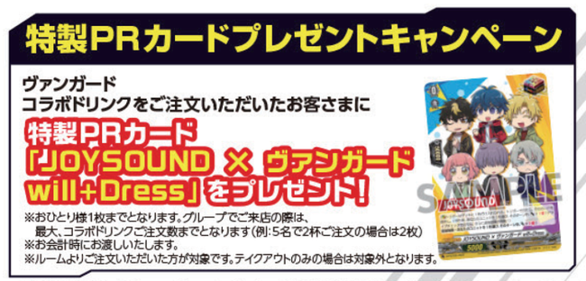 ルームよりコラボドリンクをご注文いただいたお客様に、特製PRカード「JOYSOUND×ヴァンガードwill+Dress」をプレゼントいたします!