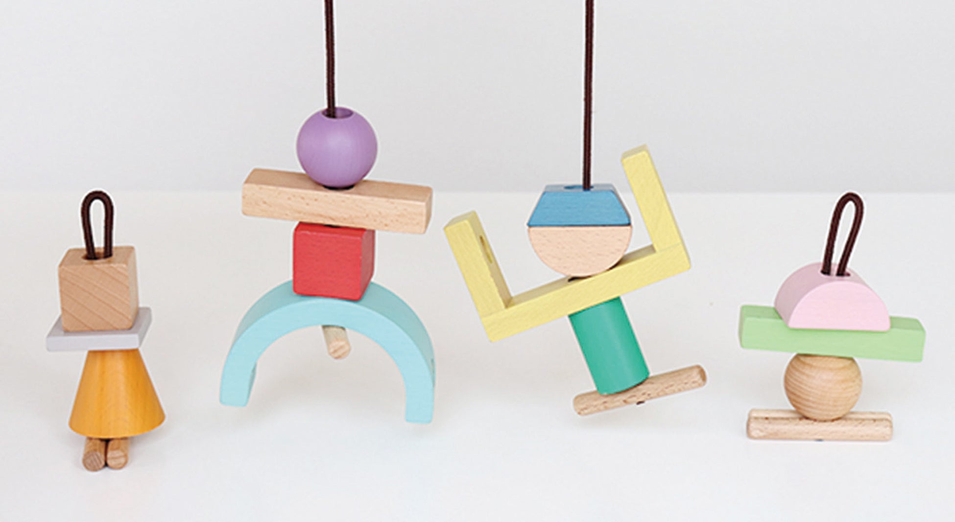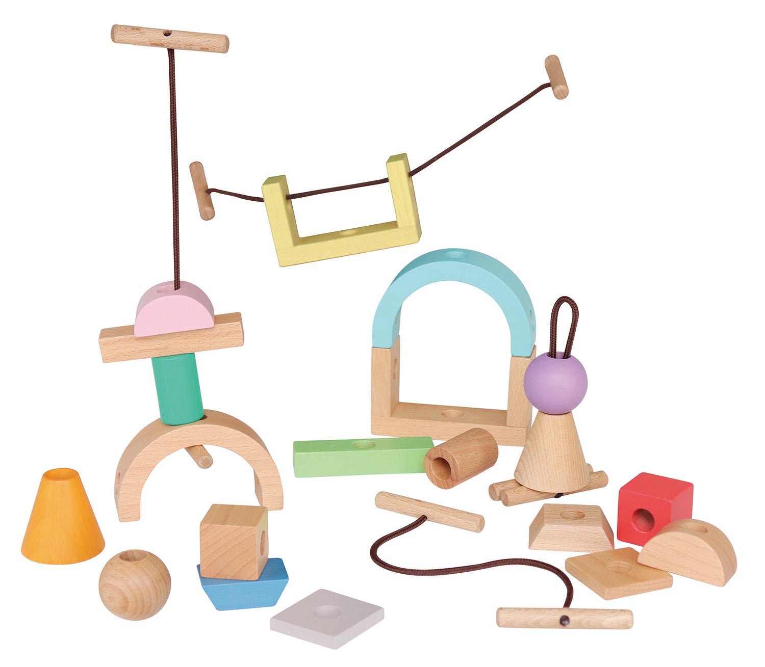 ひもの両端についている棒は、どちらの端からもピースを通すことができ、通したピースがひもから抜け落ちることを防ぐストッパーにもなります。あそんでいる最中にピースがひもから抜け落ちることがないので、自由に持ち歩いたり動かしたりする新しいあそびが楽しめます。