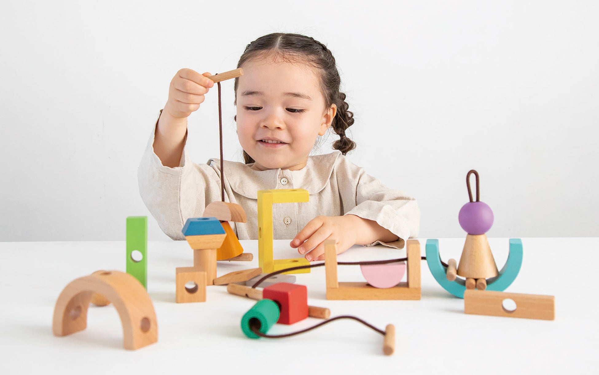 ひもを通す方向を変えたり、ピースを組み合わせて長いひもにしたり・・遊ぶ度に新たなひもの通し方を発見することができます。