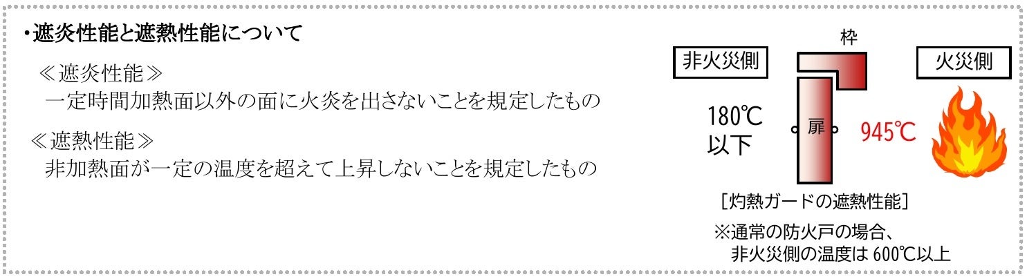 遮炎性能に加えてISO(国際規格)で規定された基準を満たす遮熱性能を有し、火災が発生した場合の扉や隣接空間の温度上昇を抑制。この遮熱性能を有する特定防火設備は、国内において業界初です。