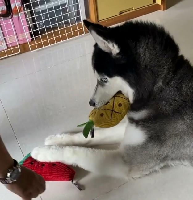 這隻名叫「Pakco」的哈士奇,已經6歲半多了,對於玩玩具的熱情卻是不受年齡增長而消退,日前疼愛牠的主人配合夏日天氣,買了西瓜和鳳梨造型的玩具給牠,想和一人(犬)一個一起遊戲,想不到Pakco卻對玩具們佔有慾爆棚,明明牠已經在玩西瓜玩具了,一發現主人拿起鳳梨玩具後,立刻過來咬著搶鳳梨玩具,還不忘用手壓住原本的西瓜玩具,彷彿在宣示主權一樣:「這些玩具都是我的!2個我都要」。