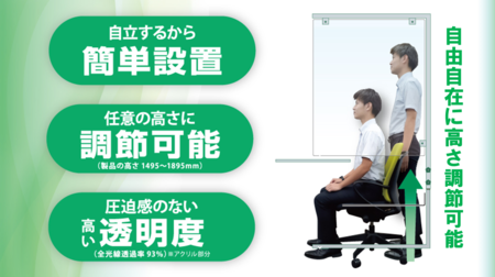 新型コロナウイルスの感染拡大に伴い、あらゆるシーンにおいて「新しい生活様式」への対応が求められています。特に人が未収する場所や対面するシーンでは、パーテーションなどを使って人と人との間を遮断することが推奨されています。その際、効果的に飛沫感染を防ぐために設置するパーテーションは身長をカバーする高さが必要だと言われており、この「伸縮する安心ガード」は、設置場所によって自由に高さを調整することができるため、幅広い用途でご利用いただくことが可能です。(製品の高さは1495mm~1895mmまで調整可能)